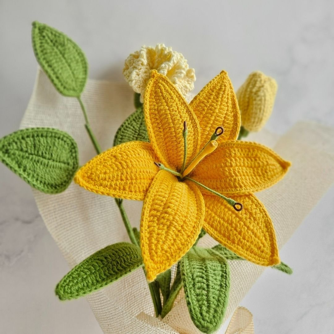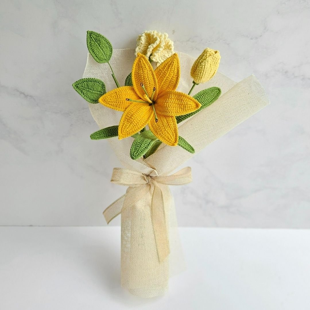- 1 Lirio, 1 tulipán, 1 clavel y 1 follaje de hojas tejidas a crochet con hilo de algodón natural (de 50 a 55cm de alto) aromatizados con esencias naturales.