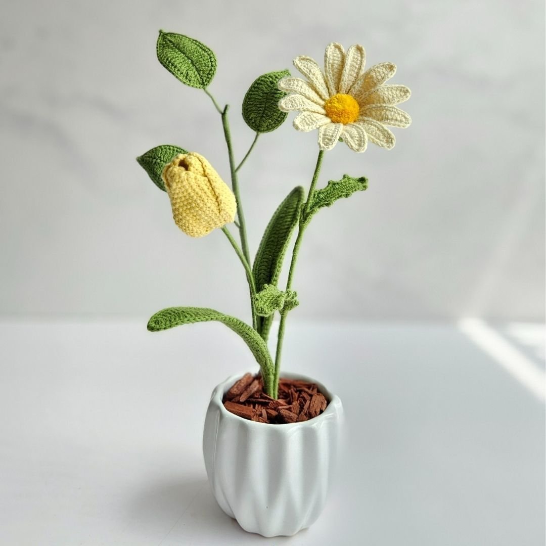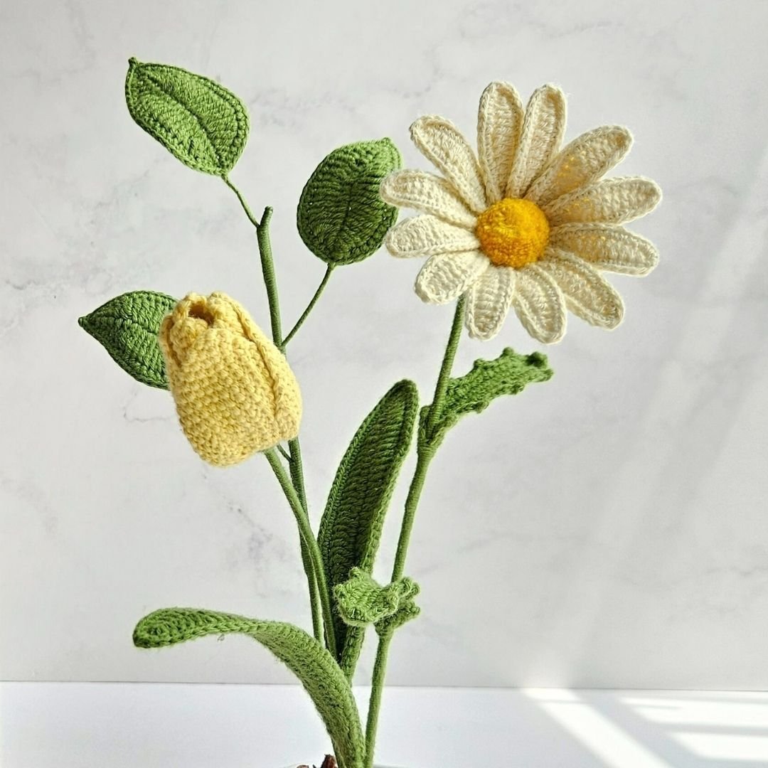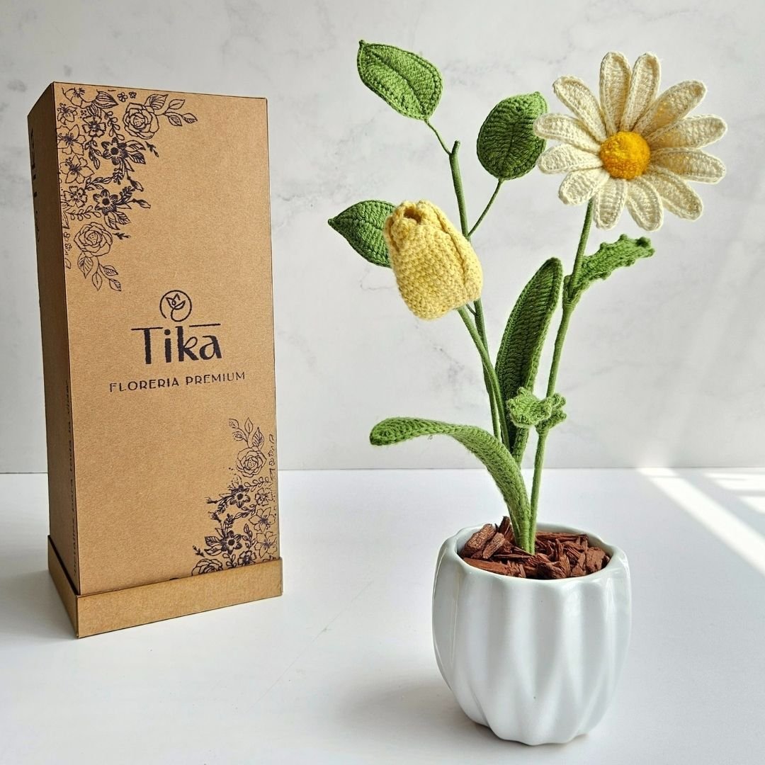 - 1 Margarita, 1 tulipán y 1 follaje de hojas tejidas a crochet con hilo de algodón natural (de 35 a 40cm de alto) aromatizada con esencias naturales.
