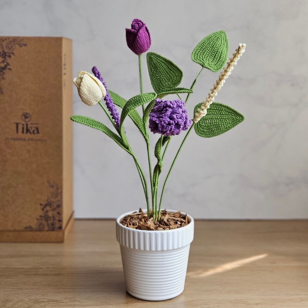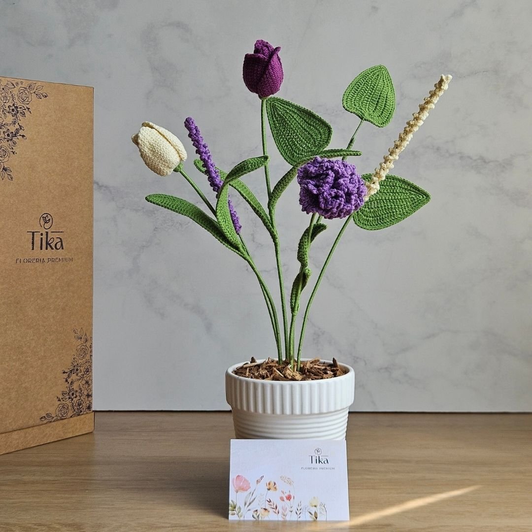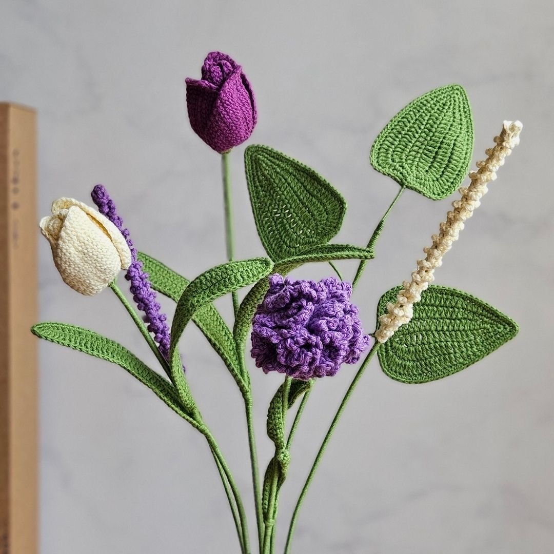 • 1 Clavel, 2 tulipanes, 1 lavanda y 1 follaje de hojas tejidas a crochet con hilo de algodón natural (de 45 a 50cm de alto) aromatizada con esencias naturales.