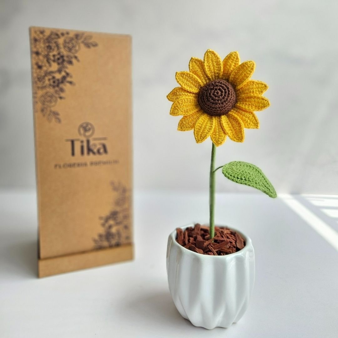 - 1 Mini girasol tejido a crochet con hilo de algodón natural (30cm de alto) aromatizada con esencias naturales.