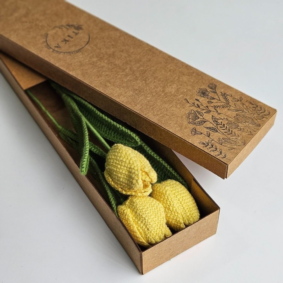 - 3 Tulipanes tejidos a crochet con hilo de algodón natural (de 45 a 50cm de alto) aromatizados con esencias naturales.